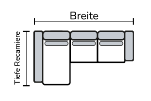 Wahlweise mit orthopädischer und großzügiger Liegefläche von 240 x 192 cm sowie einem Bettkasten in der Recamiere, ausgestattet mit Gasdruckfedern.