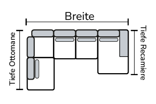 Wohnlandschaft „Nola“ U-Form, B/T/T: 390/170/230 cm, mit Schlaffunktion und Bettkasten in Ottomane, Recamiere links